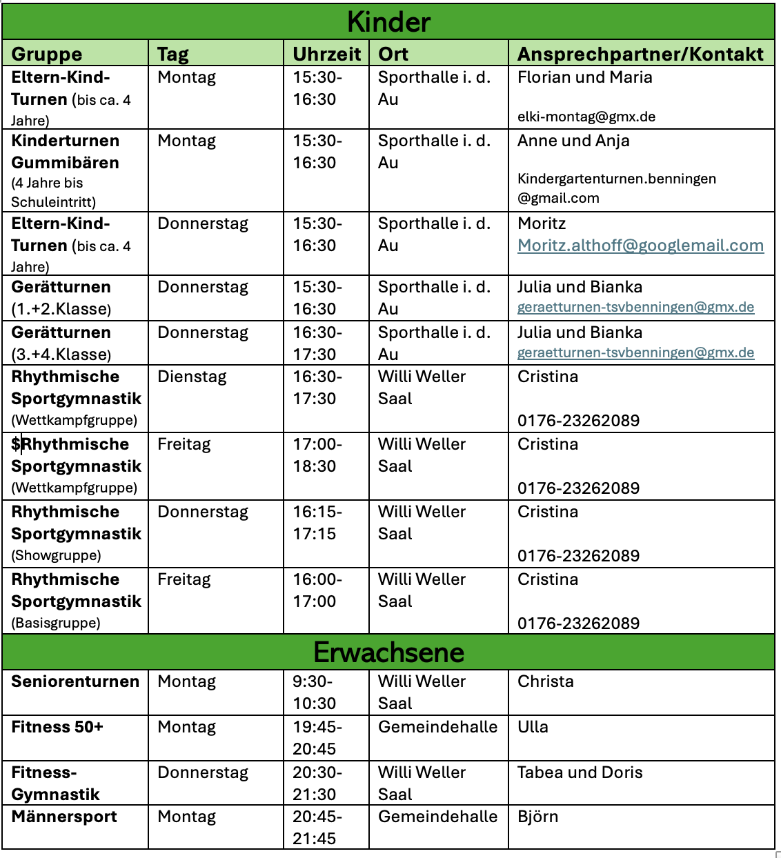 Die Abteilung Turnen bietet Spiel, Spaß und Bewegung für die Kinder vom Krabbelalter bis hin zur Grundschule. Das sportübergreifende, vielfältige Spielen und Turnen an Geräten soll den Spaß am Sport wecken und die motorische Entwicklung fördern.